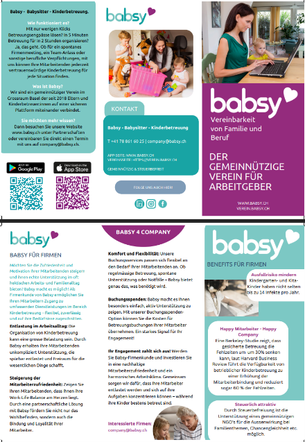 Ein grosses Dankeschön geht auch an Innovation Basel für die Gestaltung unserer neuen Flyer zu den Firmenangeboten. Durch eure innovative Herangehensweise und euer Gespür für klare, ansprechende Kommunikation ist ein tolles Ergebnis entstanden, das Babsy perfekt repräsentiert. Die Flyer helfen uns, unsere Angebote gezielt an Unternehmen zu bringen und neue Partnerschaften aufzubauen. Euer Beitrag stärkt unsere Wirkung – und dafür sagen wir von Herzen danke! Innovation Basel